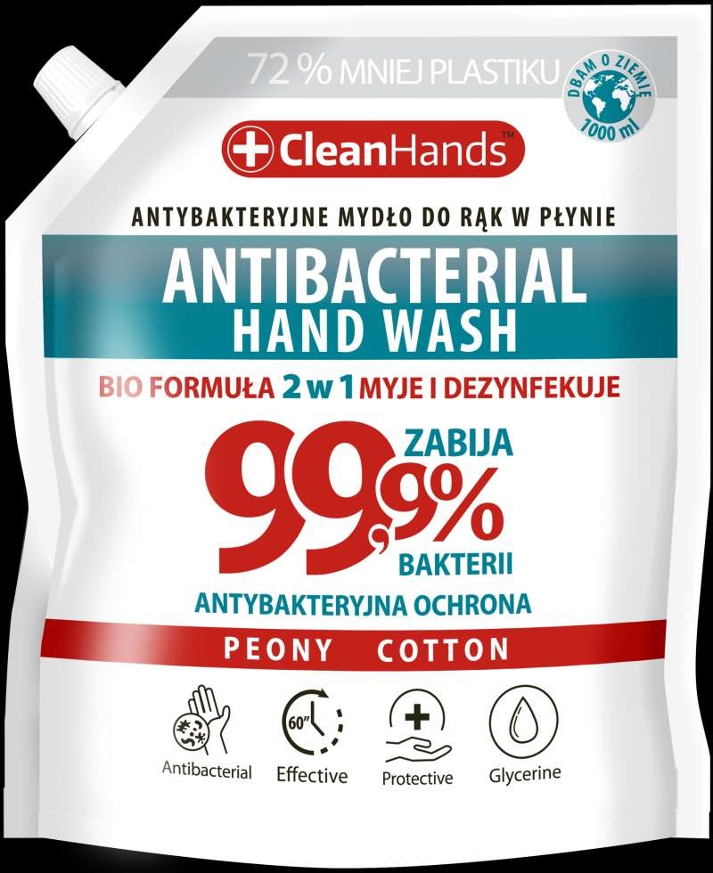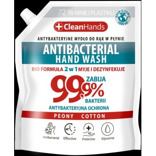 | Nazwa produktu | Mydło antybakteryjne zapas 1000 ml CLEAN HANDS Peony&Cotton bio 99% |