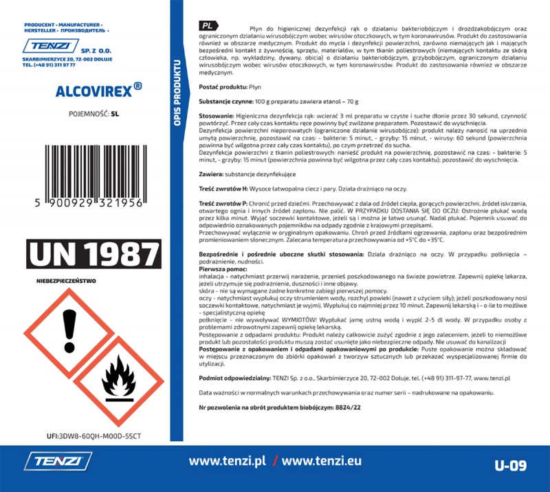| Product name | Disinfectant liquid for hands, tools, surfaces TENZI, Alcovirex, 5l |