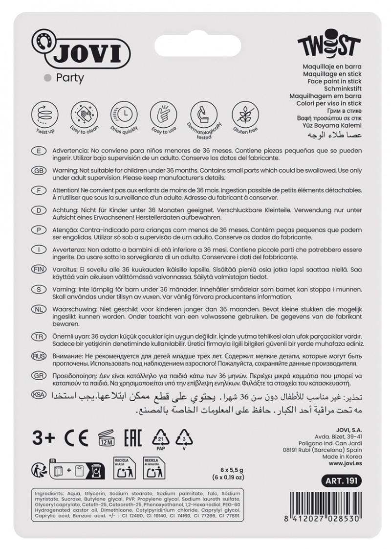 | Product name | Face paints JOVI, in stick, with cap, 6 pcs., mix of colours |