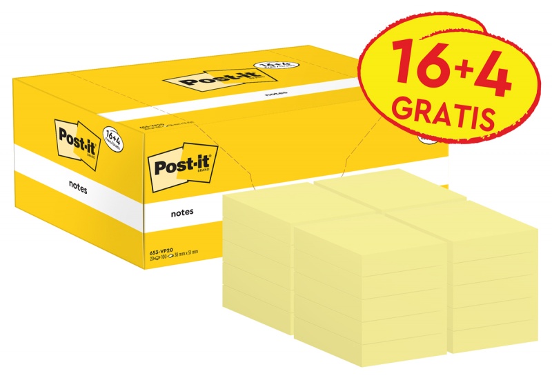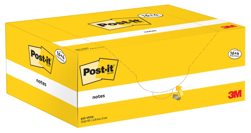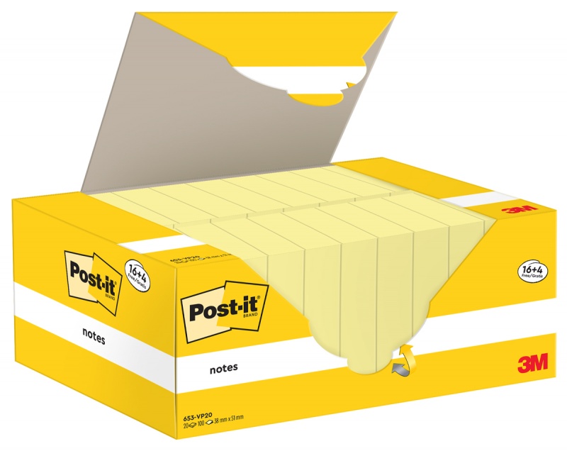 | Nazwa produktu | Karteczki samoprzylepne POST-IT® (653CY-VP20), 38x51mm, 100 kart./bloczek, 16 + 4 bloczki GRATIS, kanarkowo żółte |