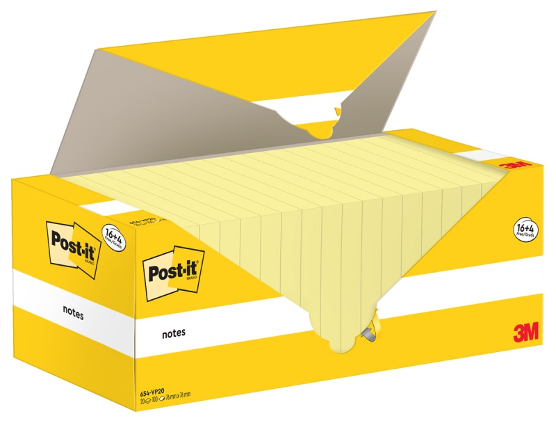 | Nazwa produktu | Karteczki samoprzylepne POST-IT® (654CY-VP20), 76x76mm, 100 kart./bloczek, 16 + 4 bloczki GRATIS, kanarkowo żółte |