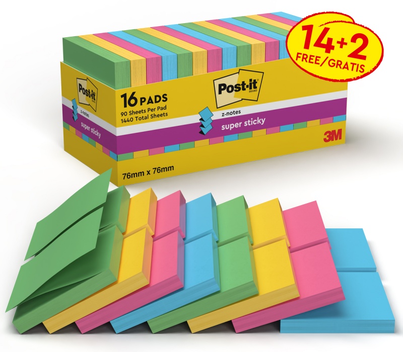 | Nazwa produktu | Karteczki samoprzylepne POST-IT® Super Sticky Z-Notes (R330-SS-VP16), 76x76mm, 90 kart./bloczek, 14+2 bloczki, mix kolorów |