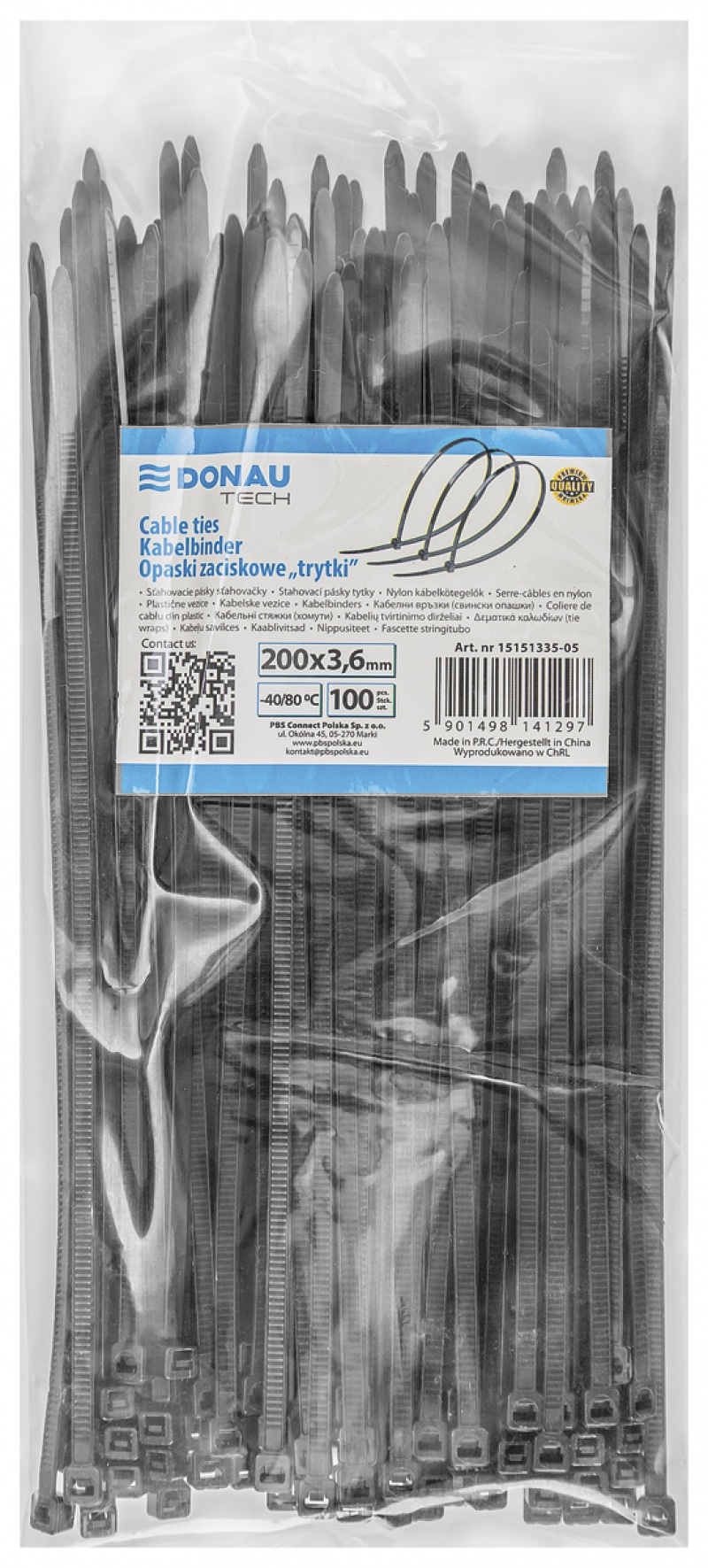 | Nazwa produktu | Opaski zaciskowe/trytytki DONAU TECH, 200x3,6mm, 100szt., temp. -40/80, czarne |